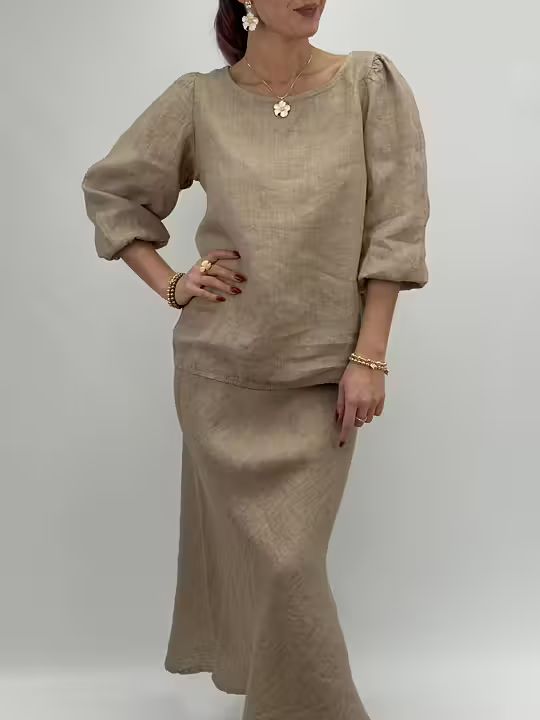 Siri är en stilren linnetopp med rund halsringning och diskreta puffärmar som ger en mjuk feminin känsla. Den raka passformen gör den lätt att styla både uppklätt och avslappnat – ett nyckelplagg i varje garderob.