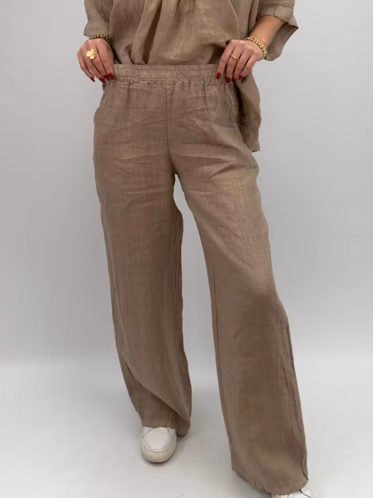 Rosali är ett par bekväma och luftiga linnebyxor med rak, vid passform och resår i midjan. Perfekta för varma dagar – både stilrena och avslappnade.