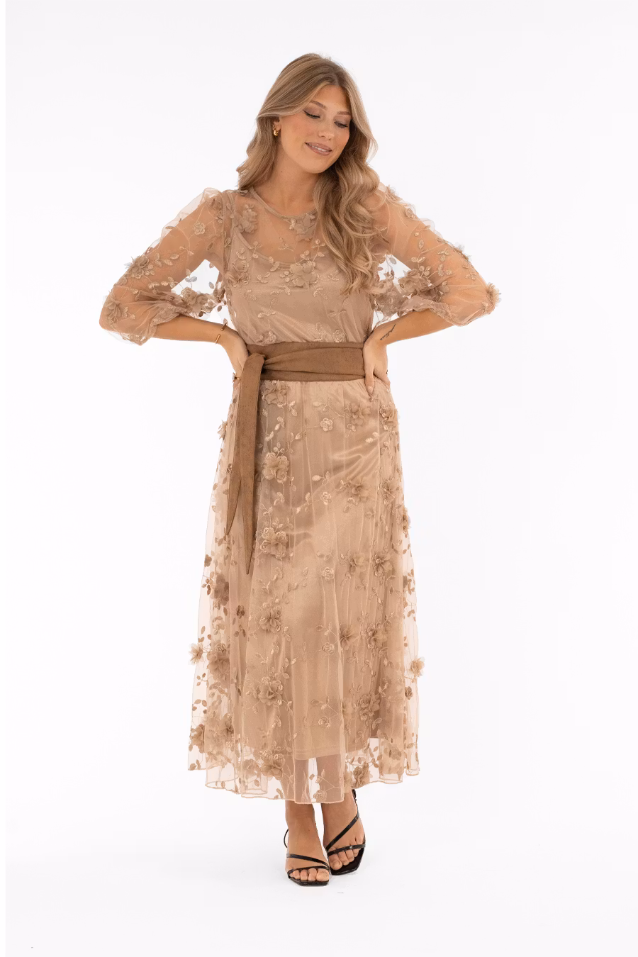 Underbart vacker a-linjekjol i skir meshkvalité, dekorerad med elegant brodyr och söta utanpåliggande blommor med 3D-effekt. Kjolen har en bred linning i glansig satinkvalité med mjuk resår på insidan, vilket ger en bekväm och smickrande passform. Hela kjolen är fodrad för ett vackert fall och en mjuk, följsam känsla. En romantisk och feminin kjol som passar perfekt till fest, bröllop eller andra speciella tillfällen.