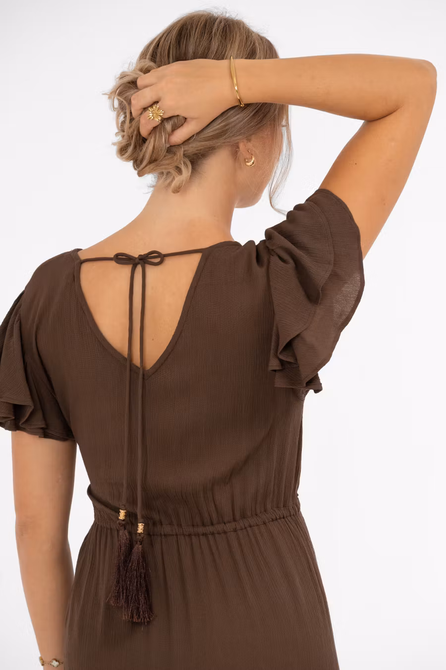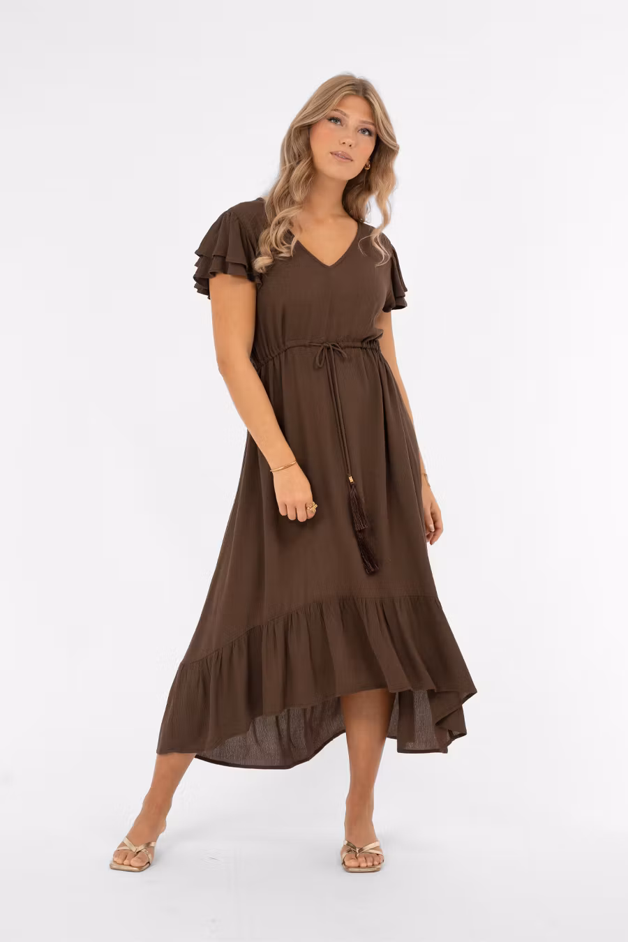 Jane Klänning är tillverkad i mjuk och följsam viskos med söta detaljer som ger en feminin touch. Klänningen är v-ringad både fram och bak, med ett justerbart knytband i ryggen för individuell passform. Midjeavskärningen har knytband framtill och resår bak för en smickrande siluett. Kjoldelen avslutas med en bred volangkant som rundar nederkanten och är något kortare framtill, vilket ger ett lekfullt och luftigt uttryck. En stilfull och romantisk klänning som passar perfekt till sommarens alla tillfällen, från vardag till fest. Kommer från märket Capri Collection