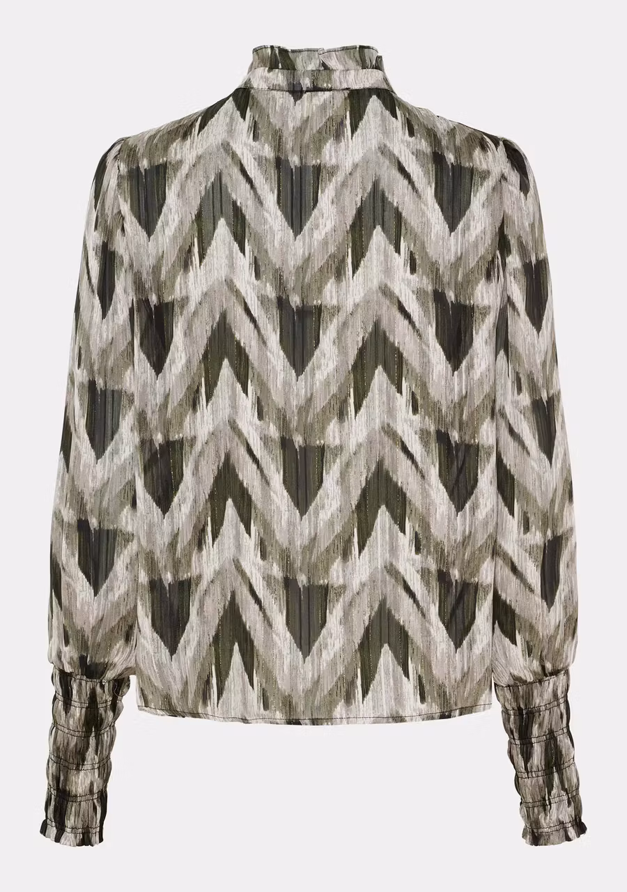 Kuna Blouse är en stilfull och lätt blus med en modern look. Den lilla stående kragen med knytband ger en diskret, sofistikerad touch, medan de långa ärmarna med breda manschetter skapar en vacker silhuett.