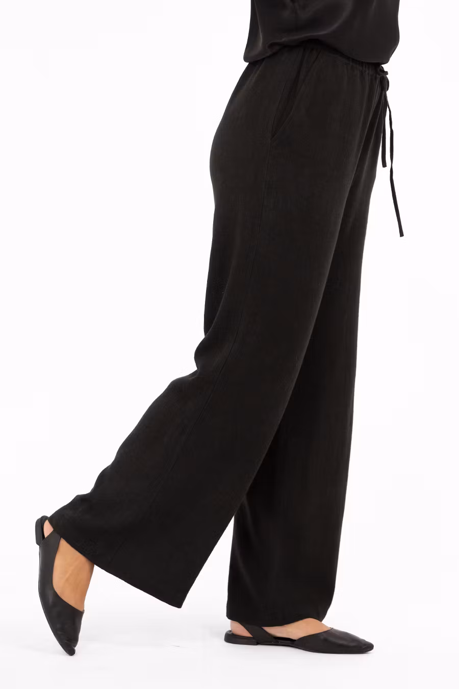 Snygg och bekväm byxa i mjuk linne- och viskoskvalité. Byxan har en smal linning med knytband för justerbar passform och snedställda, diskreta fickor vid sidsömmen. Den lediga passformen gör att byxan faller snyggt från kroppen och ger en avslappnad, modern siluett. En stilren och mångsidig byxa som passar perfekt både till vardags och till mer uppklädda tillfällen, kombinerad med toppar, blusar eller skjortor.