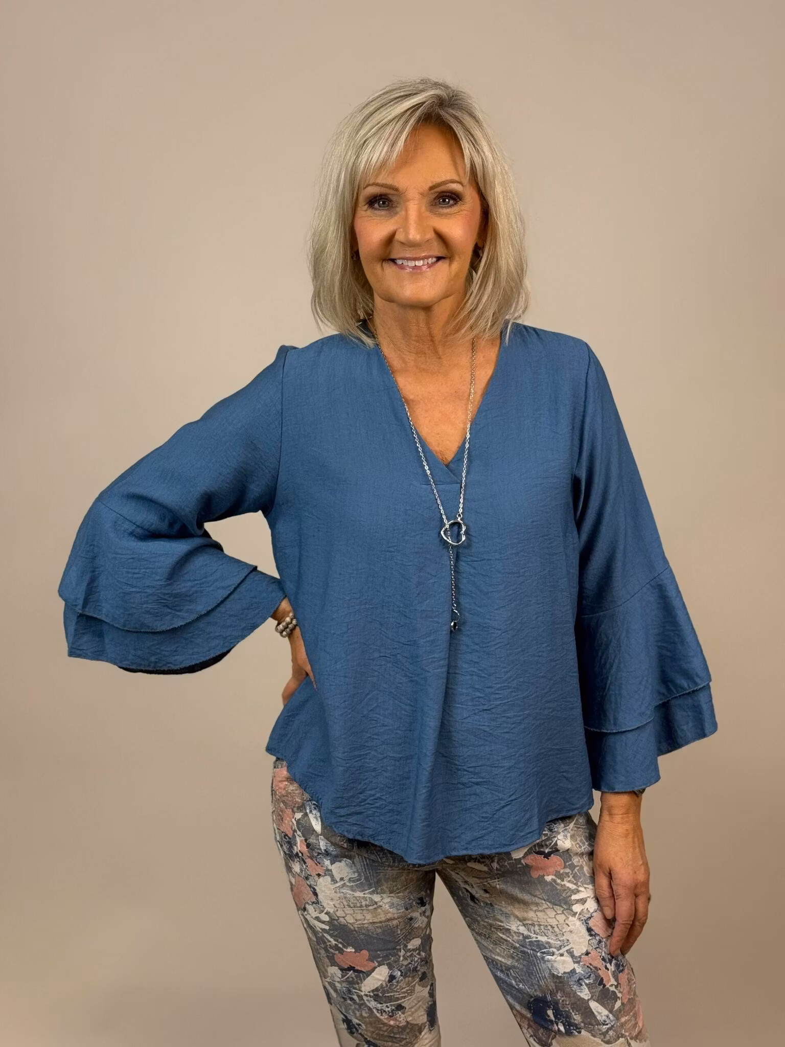 Miranda blus 499 kr Färg Färg Jeansblå Beige Storlek Storlek S/M L/XL I lager. Lägg i korgen Produktbeskrivning Recensioner Söt V-ringad blus med veck och volang på ärm från märket Mix by heart. Passar jätte fint till den matchande Mirelle kjolenMaterial 100% Viskos
