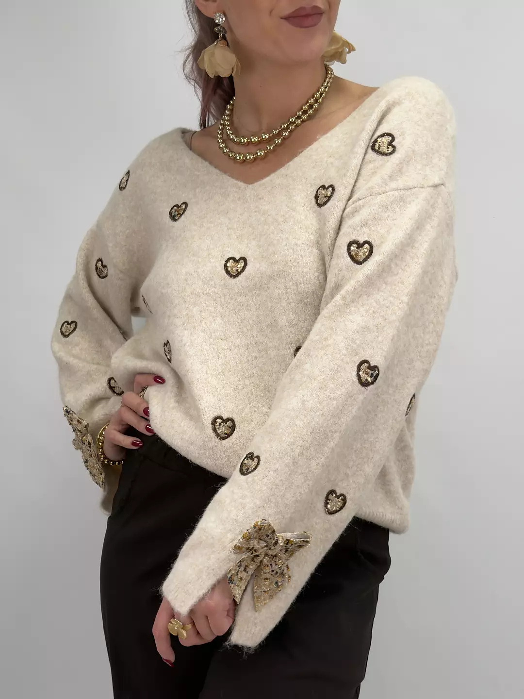 Sonja är en drömmig stickad tröja med påsydda hjärtan och dekorativa rosetter vid ärmsluten – charmig, mjuk och full av personlighet. Den djupa v-ringningen ger en feminin silhuett, perfekt för både vardagslyx och middagsdejt. Kommer från märket gemini, storlek: Onesize, (passar 34-44 enligt leverantören)