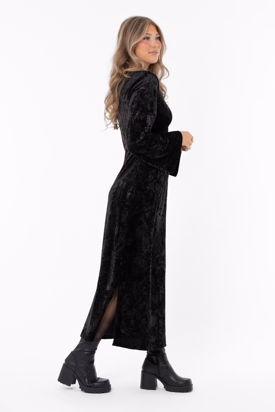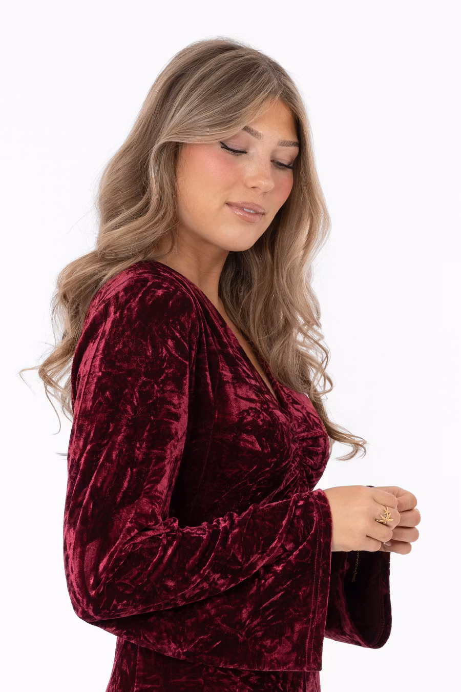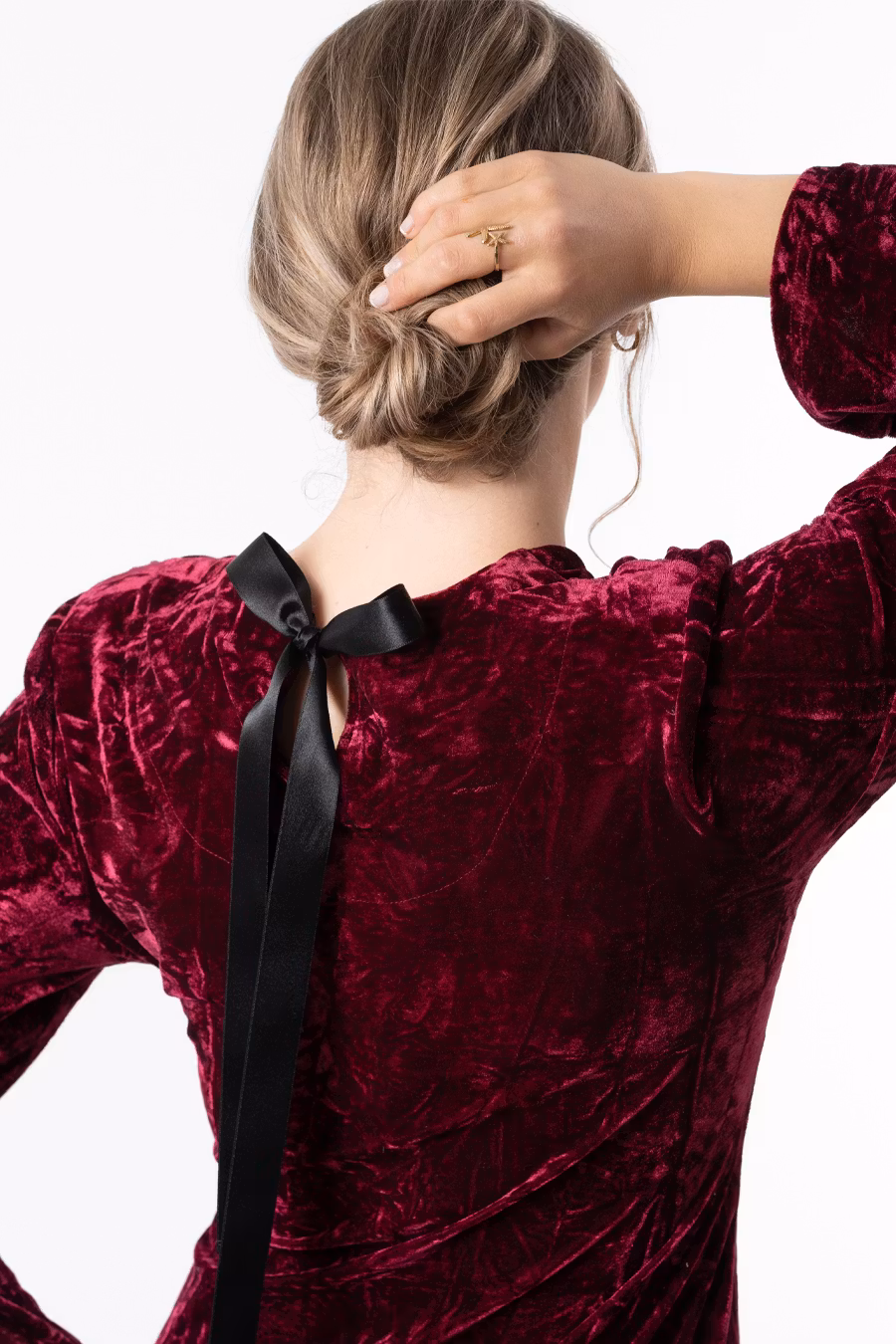 Favoriten Valerie, en klänning gjord i vacker krossad sammet. Feminin passform med v-ringad hals, axelvaddar samt drappering över bysten och avskärning under midjan. Kjoldelen släpper lite grann från kroppen utan att för den delen upplevas vid. Slits i höger sidan. I nacken är en liten öppning gjord som hålls ihop av vackra satinband. Klänningen har hellånga ärmar i lite vidare modell.