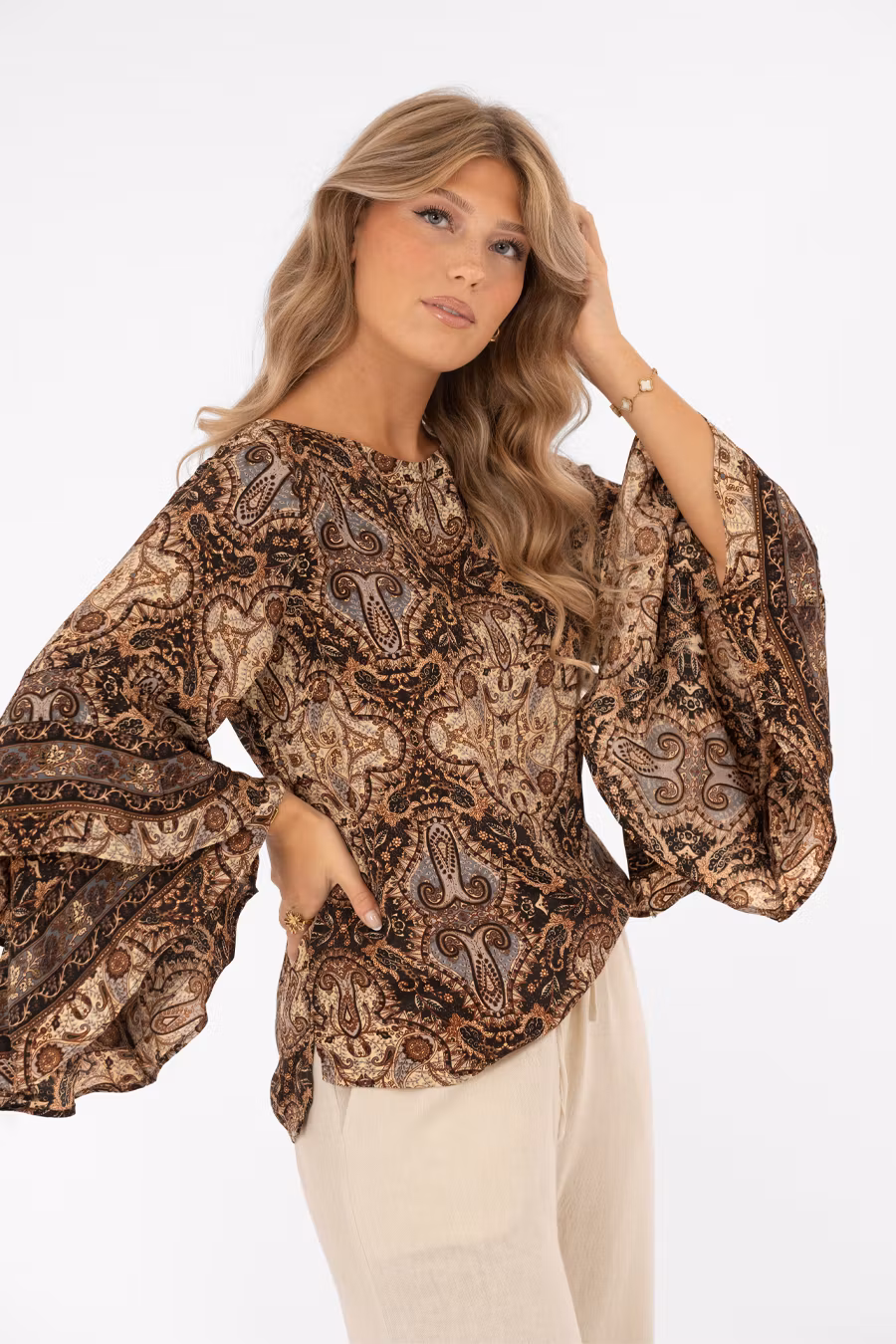 Uppgradera garderoben med en söt blus i mjuk och följsam viskos, prydd med ett vackert paisleymönster i lavendel och bruna nyanser. Den båtringade halsringningen och lediga passformen ger en avslappnad men elegant silhuett som passar både till vardag och fest. De 3/4-långa trumpetärmarna avslutas med två volanger som skapar en romantisk och trendig känsla. Perfekt att bära till jeans, kjol eller linnebyxor för en chic och bekväm look året runt.Tips! Missa inte Willa Kjol i samma serie.Material: