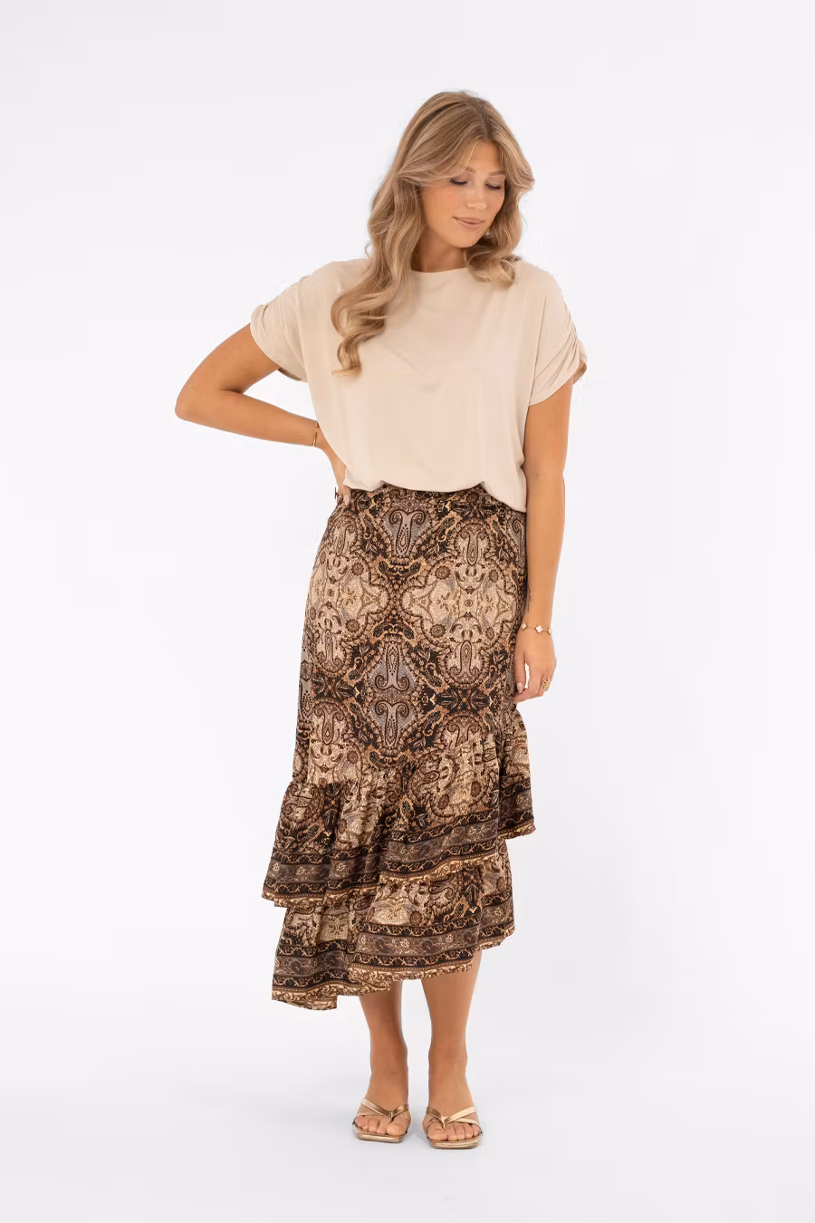 Paisleymönstrad kjol i vårens trendfärger – lavendel och brunt! Kjolen är a-linjeformad och har bred resår i midjan både fram och bak för en bekväm och smickrande passform. Nederkanten pryds av två höga volanger som ger rörelse och lekfull volym. Avslutet är snedskuret, vilket gör att kjolen är något kortare på vänster sida och skapar en modern, asymmetrisk detalj. En feminin och trendig kjol som passar perfekt till vårens alla tillfällen, från vardag till festKommer från märket Capri Collection .Tips! Bär den med tilhörande Willa Blus.