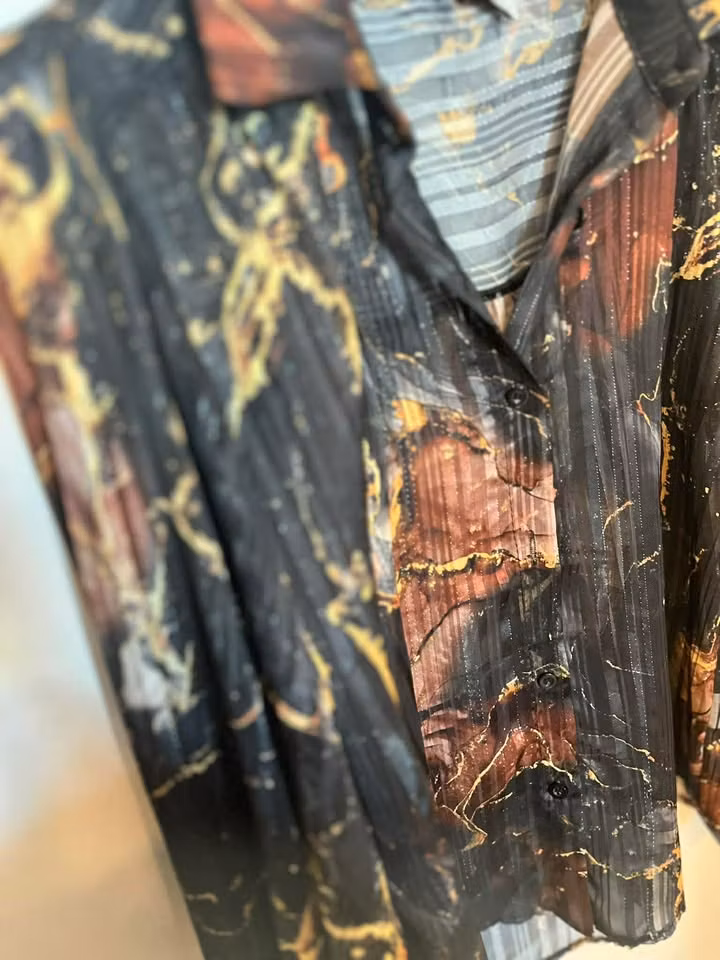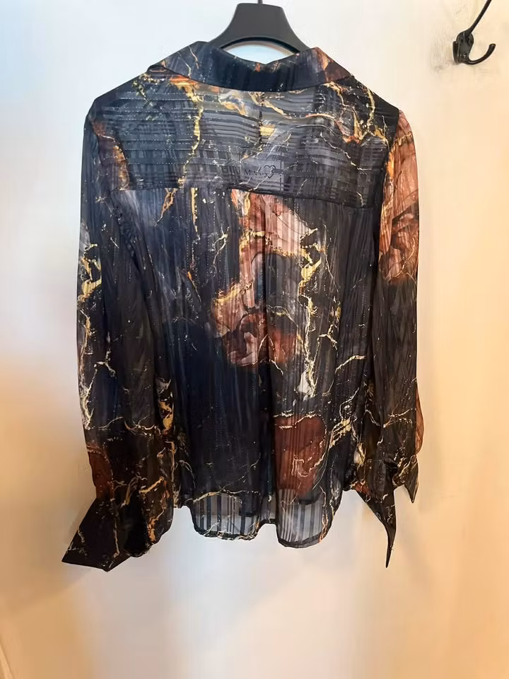 Härlig blus i lite mörkare toner men med inslag av glitter och gul/orangea toner. Där är knappar hela vägen så man kan ha den uppknäppt. Blusen kan upplevas lite genomskinlig så kan vara bra med linne eller en top under. Kommer från märket Mix by heart